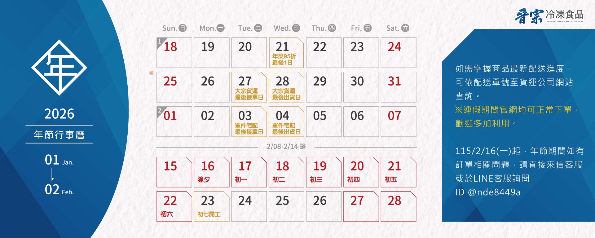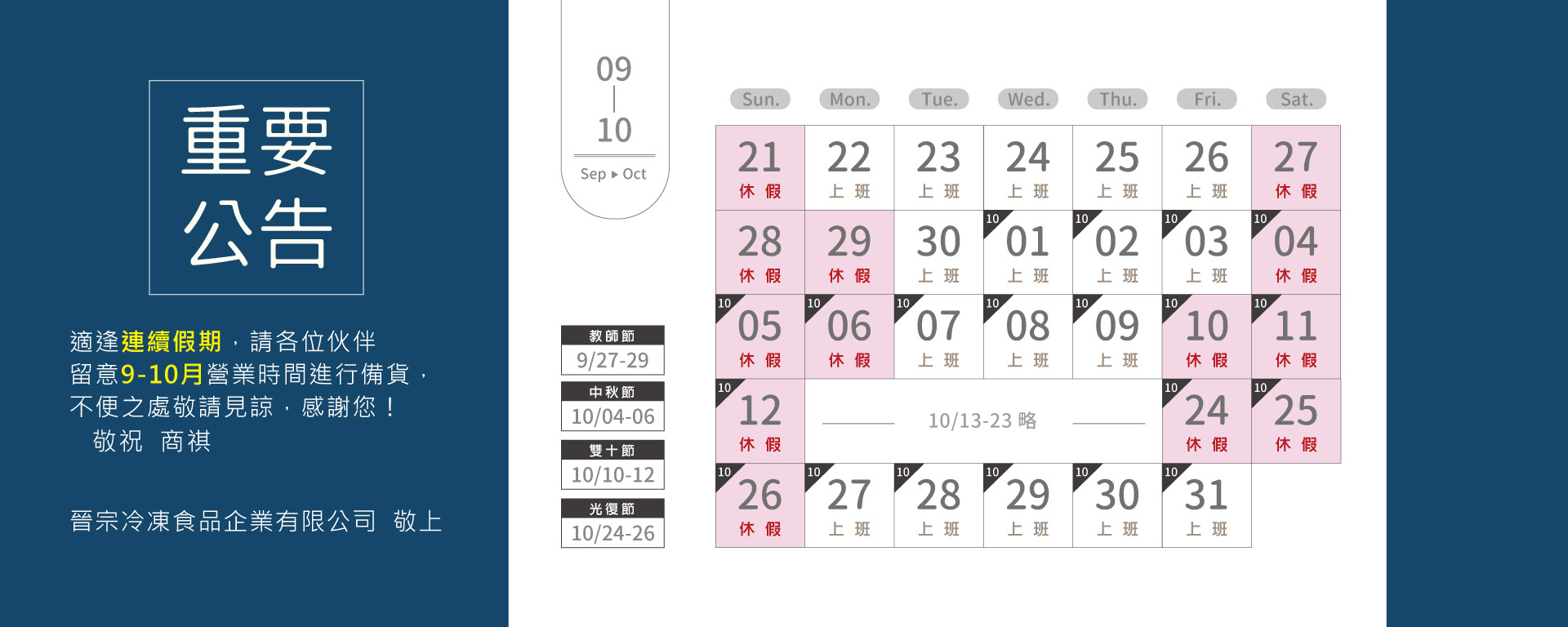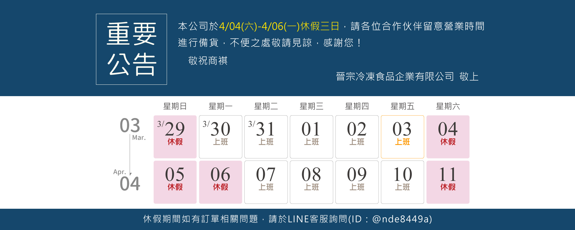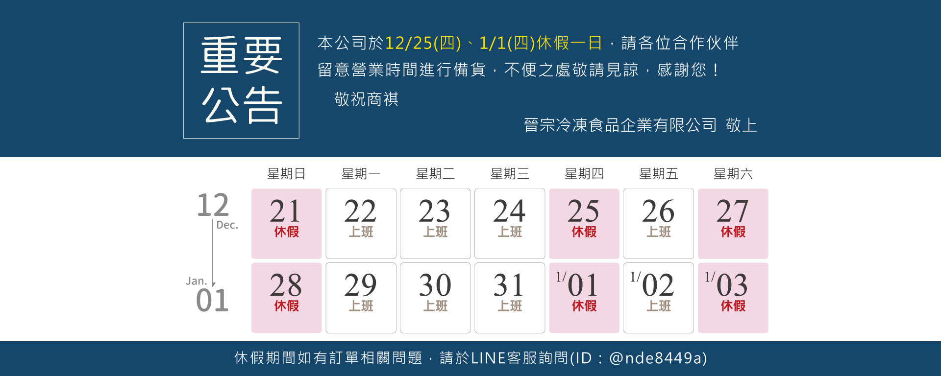 晉宗冷凍營運&休假公告